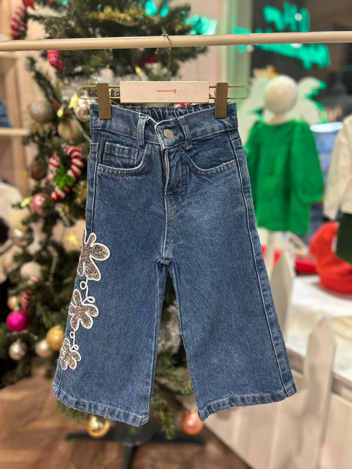 İŞLEME VE PUL DETAYLI BOL PAÇA KOT PANTOLON Koyu Mavi