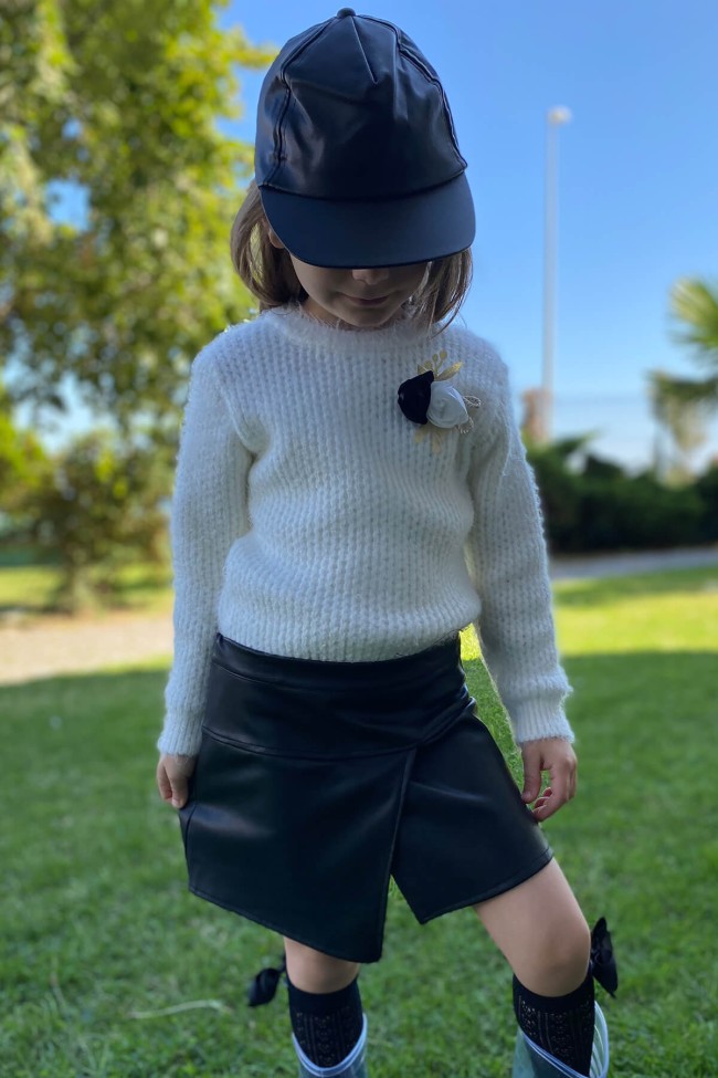 Deri şapka Broş detaylı, örme, desenli kazak Kat detaylı, beli lastikli, deri etek