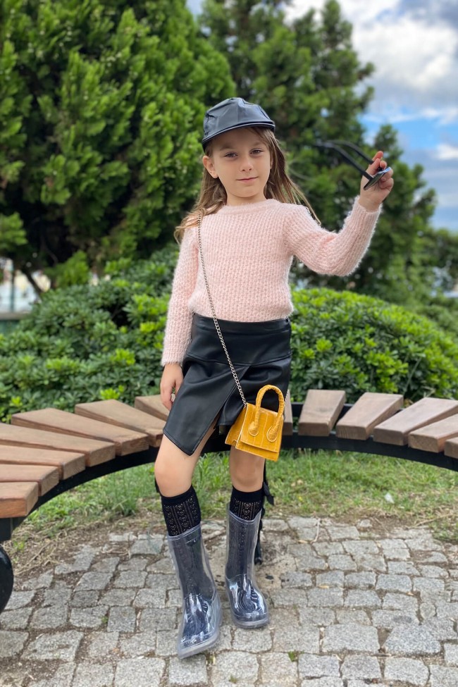 Deri şapka Broş detaylı, örme, desenli kazak Kat detaylı, beli lastikli, deri etek