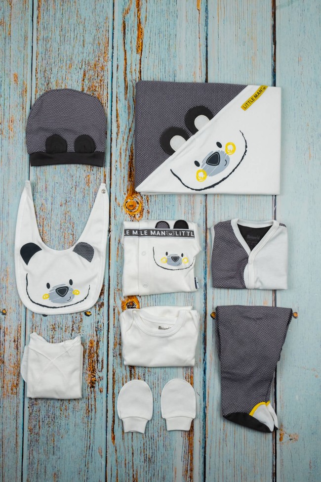 %100 organik pamuk. 10 parça. Battaniye, üst zıbın, pantolon, yelek, badi, iç zıbın, önlük, şapka, eldiven, mendil.