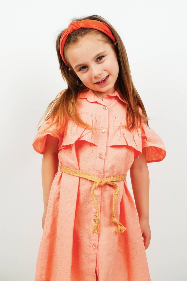 %100 Pamuk Düşük omuz, göğsü fırfırlı, beli hasır kemerli, robadan elbise