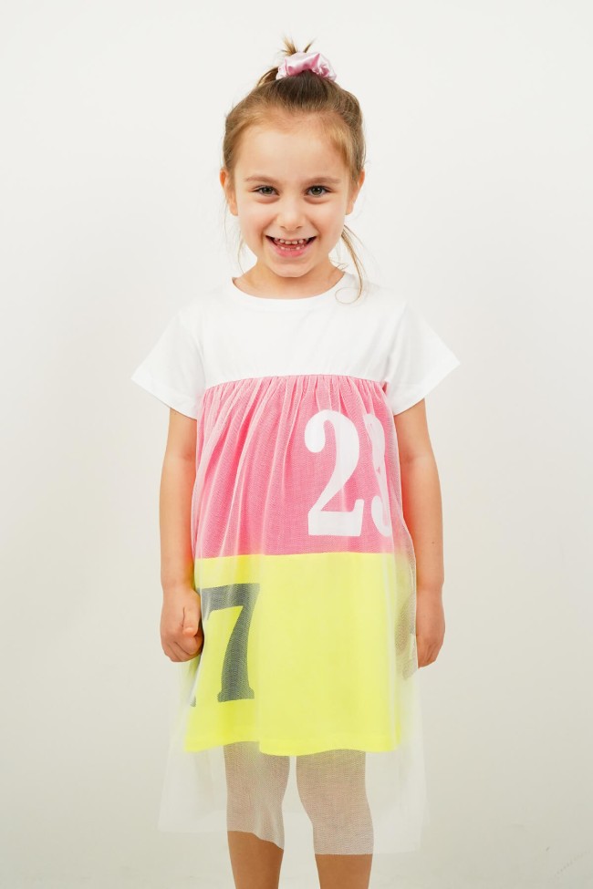 Sayı baskılı, tüllü, çok renkli, parçalı elbise.