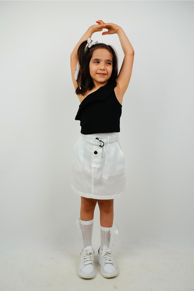 Tek askılı, volanlı düz renk Bluz. Cepli, beli lastikli, düğmeli, etek.