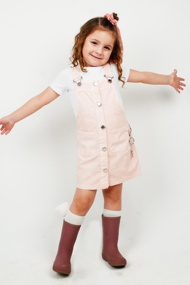 %100 Pamuk Zincirili, önü düğmeli, cepli, ayarlanabilir askılı, kelebek desenli salopet